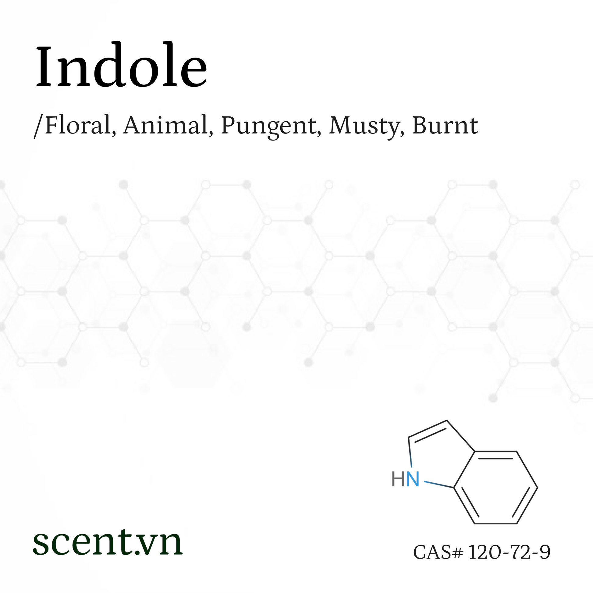 Indole là chất thơm có cấu trúc vòng dị hợp nitơ, xuất hiện tự nhiên trong hoa nhài, ngọc lan tây, sen… Ở nồng độ cao, indole mang sắc thái animalic–ấm, hơi “mộc” và u tối; nhưng khi dùng ở liều cực thấp, nó mở ra một diện mạo khác: ngọt kem, hoa trắng, phấn mịn và rất sang, giúp hương hoa trở nên chân thực và sống động.
